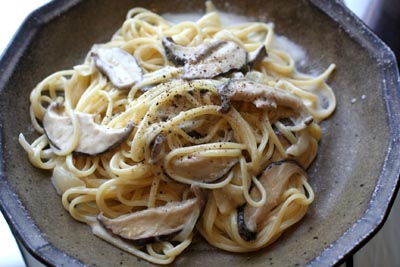 薄くスライスした玉ねぎをオリーブオイルでじっくり炒めて、しんなりしてきたら適当な厚さに切ったしいたけを加えてさらに炒めて、生クリーム・牛乳を加え、火が通ったらマスカルポーネとタレッジオチーズを入れる。塩分が強いのでタレッジオは控えめに。