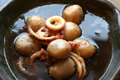 里芋は和風だし・酒・醤油で煮て、イカを片栗粉でまぶして揚げて煮物の中に入れました。