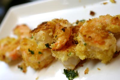 ボールにパン粉、オリーブオイル、パルメザンチーズ、少量の溶き卵、塩、コショウを合わせ、エビを入れて混ぜ合わせる。