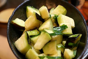 水茄子にシンプルに大葉をくわえ、柚子ソルトで和えただけです。仕上げにゆずも絞って。