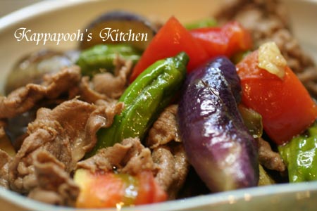 なすとしし唐を素揚げして、鍋に水、和風だし、酒、砂糖、醤油、鶏ガラスープを入れて、火にかけ豚肉をいれて煮ます。