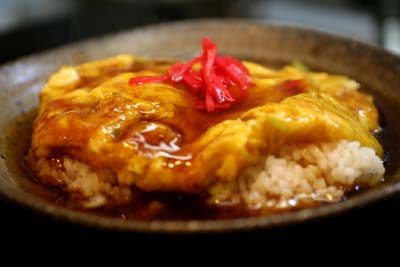 卵にネギのみじん切り、軽く塩・コショウをしてを加えて焼き、ご飯の上にかけてタレをたっぷりかけました。