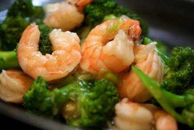 フライパンにみじん切りしたニンニクと生姜(この日は2分の1かけ分、生姜もニンニクと同量)を炒めて香りがでてきたら、海老を炒めて、海老の色が変わったらブロッコリーも加えて、酒・鶏ガラスープ・塩・コショウで味を調えます。(お好みですが、私は結構酒は多めに入れます。アルコール分を飛ばして味見をしながら調節します。)