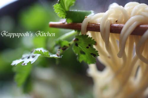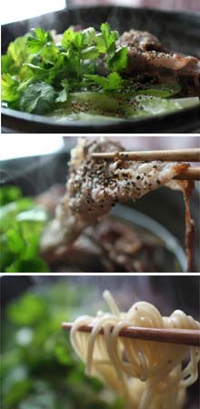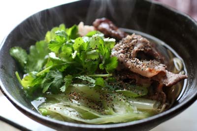茹で上がった麺をよく湯きりして器に盛り、スープを注いで、ネギ、牛肉、パクチーをたっぷり盛り付けて出来上がり。