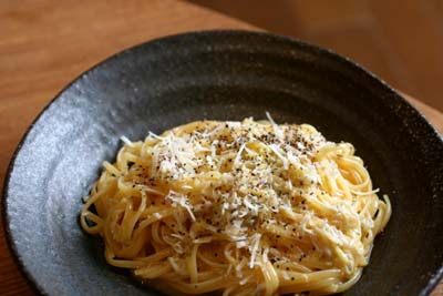 卵と生クリーム・じゃこ・パルミジャーノチーズをすって混ぜ合わせておいて、茹でたてのパスタを和えました。