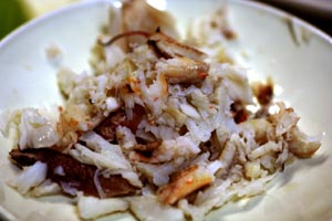 だんだんお腹がいっぱいになってきたけれどこれでは足りないとタコをオリーブオイルでにんにくと炒めて、ワインとチーズ・塩・コショウで味付けしたものもつまみでいただきました。