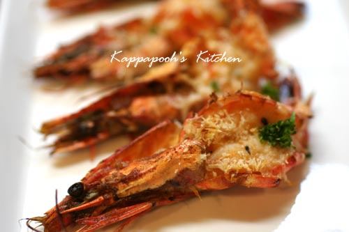 火が通り過ぎないようにして、パルミジャーノチーズをすり下ろしてえびに乗せ、パセリを散らしてオーブントースターでチーズが溶けるまで加熱します。