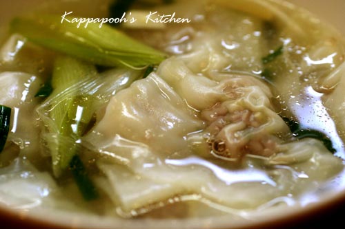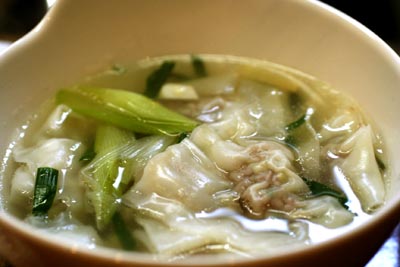 ワンタンを別なべに沸かしたお湯でいったん軽く火を通して、スープに入れてできあがり。