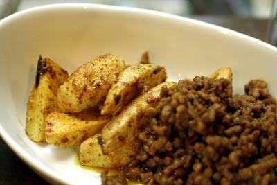 里芋を塩・コショウ・鶏ガラスープ・カレーパウダーで味付けしたものです。ひき肉も同様に炒めて添えました。にんにくも入れたかな?