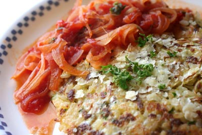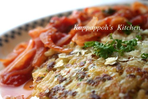 残りご飯にこれを混ぜ、卵を割りいれ、チーズとパセリのみじん切り・キャベツの千切り(少々)を加えてよく混ぜ、お好み焼きを焼くような要領でオリーブオイルをひいたフライパンで、片面は焼き色がつくまで焼き、ひっくり返して軽く焼き、器に盛ります。