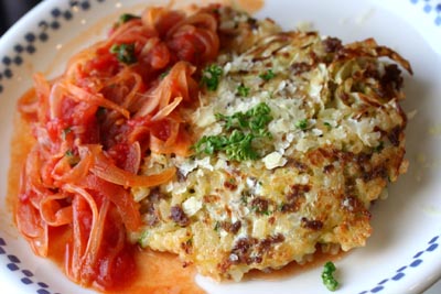 焼いたご飯にトマトソースをかけて、パルメザンチーズ・パセリを散らしてできあがり。