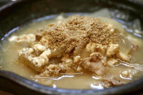 豆腐をくずして入れ、火が通ったら、すりごまをたっぷり加えます。