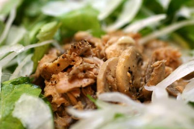 マッシュルームをニンニクとツナで炒めて白ワインを加え、塩・コショウしたものをスライスオニオンとベビーリーフでいただきました。