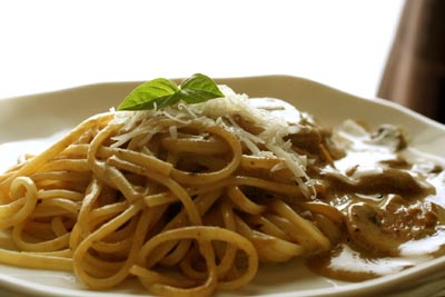 特に変わったことはしなくって、牛乳とチーズ(パルミジャーノ)を加えただけ。(生クリームは入れてません。)あ、それとキレイなマッシュルームを買ってきてあったので、それをスライスして加えました。一番最後に入れてあまり火を通しすぎないようにします。