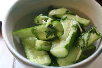 たたききゅうりにして塩をしておき、酒、生姜の千切り、大葉でよく揉んだだけです。