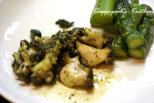 殻ごと網で焼こうかとも思いましたが、今日はスライスして、バターでニンニクを炒めて、まず肝を炒めて、身を入れて、白ワイン、酒を加えて、塩・コショウで味付けしました。