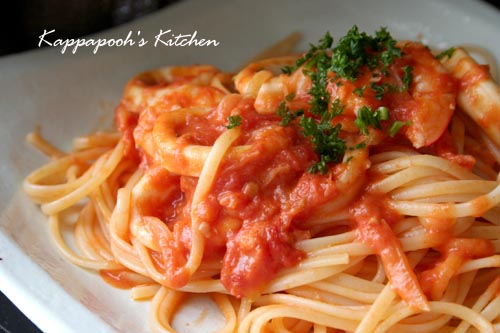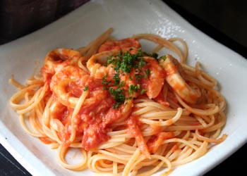 ニンニク、たまねぎのスライスをオリーブオイルで炒めてホールトマトを入れてつぶしながら煮込んでいき、エビ・イカを入れ、白ワインを入れてさらに煮込み、鶏ガラスープ・塩・コショウで味を調えて、生クリームを入れてさっと一煮立ちさせて出来上がり。