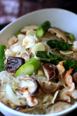 フライパンに油をひき、にんにくを炒め、適当な大きさに切ったエビ・茹でたアスパラ・戻した干ししいたけを加え炒めて、酒・戻し汁・鶏ガラスープ・塩・コショウで味を調え溶き片栗粉でとろみをつける。