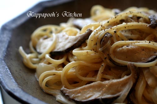 薄くスライスした玉ねぎをオリーブオイルでじっくり炒めて、しんなりしてきたら適当な厚さに切ったしいたけを加えてさらに炒めて、生クリーム・牛乳を加え、火が通ったらマスカルポーネとタレッジオチーズを入れる。塩分が強いのでタレッジオは控えめに。