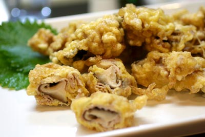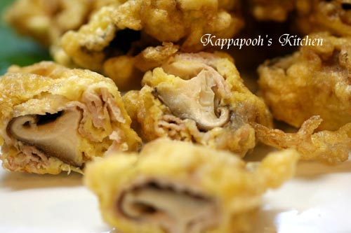 しいたけを適当に切って薄切りの豚肉で巻いて天ぷらにしただけです。