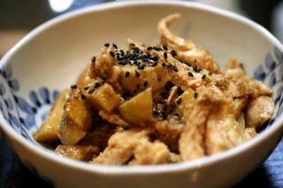 最初は里芋を揚げようかと思いましたが、レンジで加熱して胸肉を利用したのでごま油を少しだけ加えました。