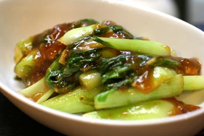 チンゲンサイを適当な大きさに切って、ニンニクで炒めて酒・鶏ガラスープ・豆板醤・テンメンジャンで味をつけて水溶き片栗粉でとろみをつける。