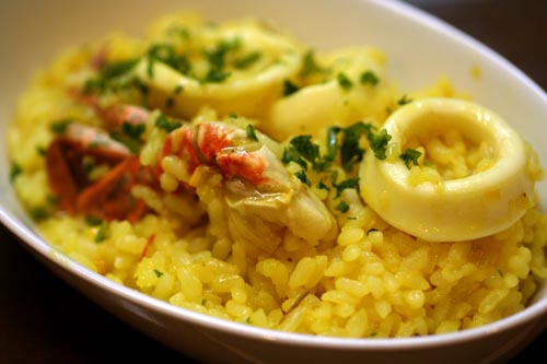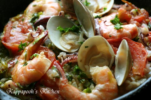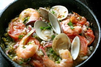 小さなフライパンにオリーブオイルをひき、にんにく、玉ねぎを炒めて、セロリ、お米を入れ、軽く炒めて、水をひたひたになるまで加え、サフラン、鶏ガラスープ、塩、コショウで味を調え、エビ、はまぐり、いか、トマト、を乗せて白ワインを多めに入れふたをする。