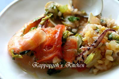前日の残りのブイヤベースのスープに入れ忘れたイカを足して、リゾットを作りました。あ、間違えたホントは冷ご飯を入れておじやでした。