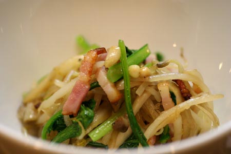 ごぼう、もやし、エリンギ、小松菜、ベーコン、松の実、にんにく、醤油、固形スープなど。