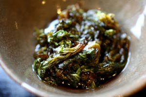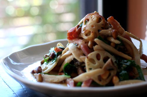 醤油、オリーブオイル、すりおろしたニンニク、エリンギとニラを煮たスープを少し加えて、味を調えたら、エリンギ、ニラ、レンコン、ベーコン、松の実を合わせてさっと混ぜ合わせる。