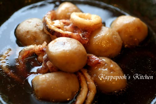 里芋は和風だし・酒・醤油で煮て、イカを片栗粉でまぶして揚げて煮物の中に入れました。