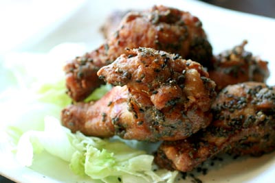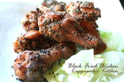 低温の油でじっくり揚げて、出来上がりにさらに黒ごま、黒コショウを振りかけておく。