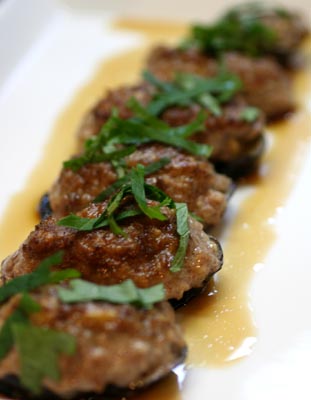 で、冷蔵庫にもう使ってしまわなくっちゃいけないひき肉があったので、それに生姜のみじん切り、溶き卵、小麦粉、パン粉を混ぜ込んで練り、なすと合わせて焼きました。