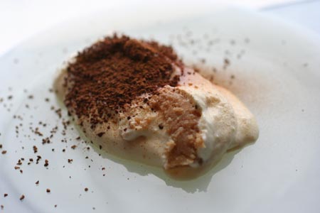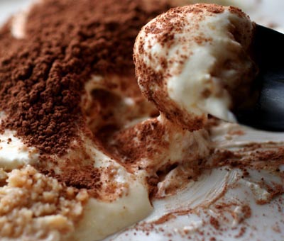 マスカルポーネに卵黄を加えて混ぜ、生クリームをあわ立ててあわせただけ。生地はビスケットを砕いて、コーヒー・ブランデーを加えて、溶かしバターで固めたもの。(砂糖はお好みで、生地の方を甘くしたほうがいいかも)