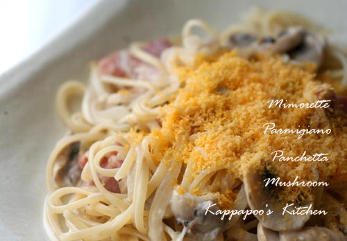 玉ねぎとマッシュルームのうすぎり・パンチェッタをオリーブオイルで炒めて白ワインを加えて水分を飛ばして、バターを加え混ぜ、生クリームを加えます。すりおろしたパルミジャーノを入れて、茹で上がったパスタを加えてお皿に盛り、すりおろしたミモレットを盛ってできあがり。