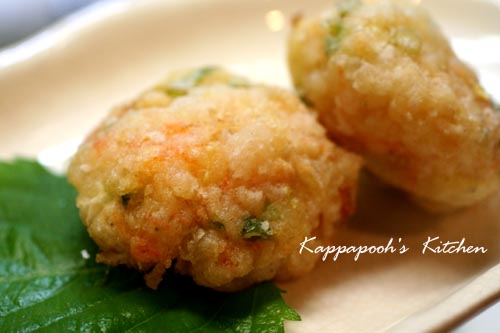 レンジで皮ごと加熱したジャガイモを2分の1加えて、塩・胡椒を少々・溶き玉子少々・片栗粉を少々入れ、香りねぎ・大葉を刻んで加えて丸めます。