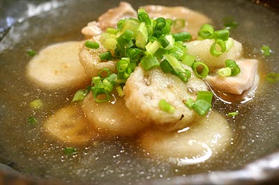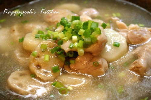 鶏もも肉を和風だし、鶏がらスープで煮て、酒(多めに)・塩・醤油・砂糖(各少々)で、薄味のスープに味を調える。