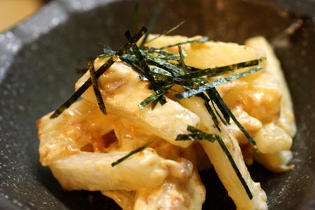 長芋を酒を加えて油で炒めて、マヨネーズ、自家製梅干しを細かく切ったものと酒で和えました。