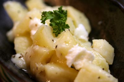 ジャガイモをレンジで加熱して、ハーブソルト、モッツアレラチーズを加えてオリーブオイルで和えただけ。