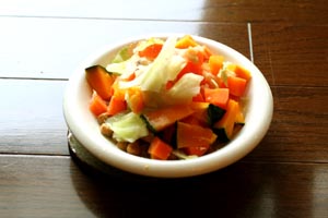 ぷーも最近重くなってきたんです。朝は野菜中心。にんじん、キャベツ、かぼちゃを鶏を煮たスープで煮ました。フードが下に入ってます。