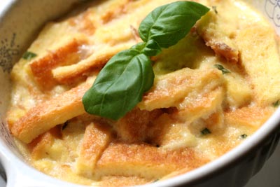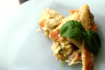 たまご一個をボールにときほぐし、牛乳150ccを加えて、ツナとキャベツを合わせて入れ、バジルのみじん切り、パルメザンチーズをたっぷり入れて、パンの耳を適当に切って入れ、塩・コショウして味を調えます。