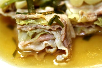 豚バラ肉とキャベツを、もつ鍋のようなスープで煮ました。このスープ、大好きなんです!