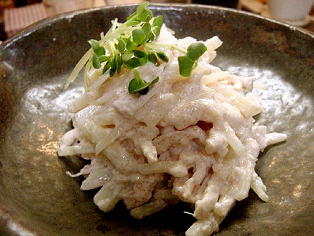 すり鉢で、豆腐をなめらかにして、マヨネーズ、明太子、酒を加えて混ぜ、細切りにして、さっと茹でたジャガイモと、レンジで加熱した鶏胸肉を裂いたものを加えて和えました。
