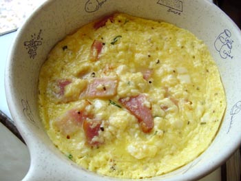 豆腐と卵のソースがあまったので、ここにもベーコンを入れて、レンジで加熱して、ヘルシーオムレツにしました。