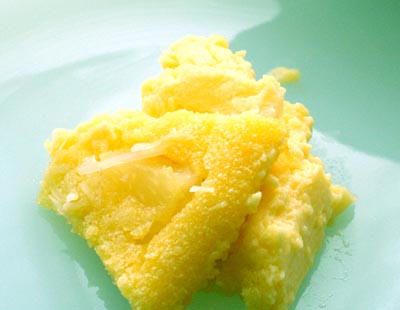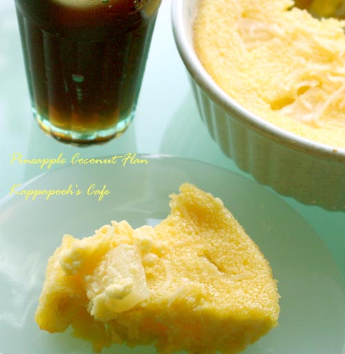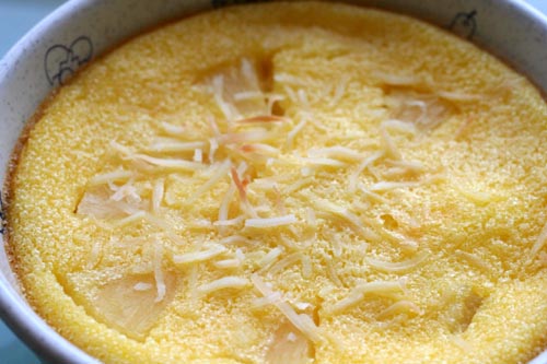 これを漉しながら型に流して、小さく切ったパイナップルを均等に入れ、ココナッツロングを散らしてオーブンで30分焼きます。