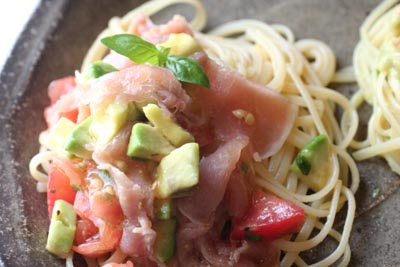 茹で上がったパスタをここに入れて和え、器に盛ったら、さいの目のアボガド、鮭フレークを散らして出来上がり。