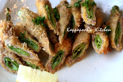 テレビで串カツの映像を見てしまったら、もう揚げ物が食べたくってしょうがなくなり、冷蔵庫、冷凍庫をあさって、豚肉と甘長ピーマンを使って、フライにしました!
