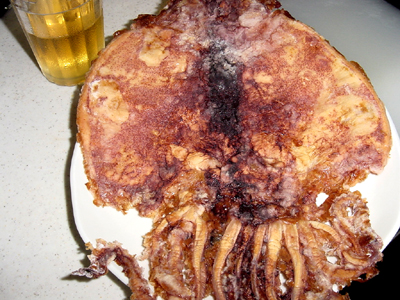 お皿からはみ出たこのイカは、海老せんべいの「一色屋」で買ってきた、赤ワイン焼きというものです。