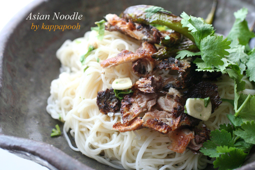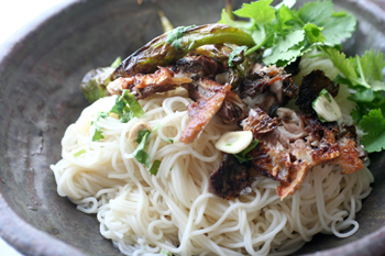 茹で上がったソーメンを洗って、冷水でしめて、いわしとパクチーを盛り付けて、タレをかけていただきます。