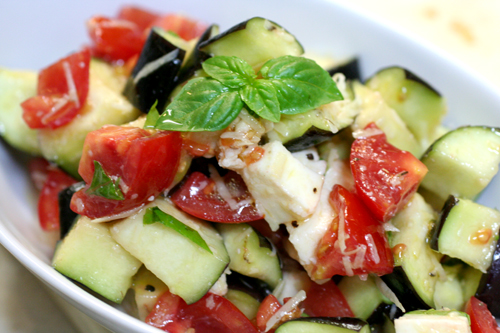 なすは適当な大きさに切って、塩をして、しばらくしたら、軽くしぼります。とまととモッツアレラチーズを角切りにし、バジルをみじん切りにして、なすと一緒にまぜてクレイジーソルトをかけて手でまぜておく。